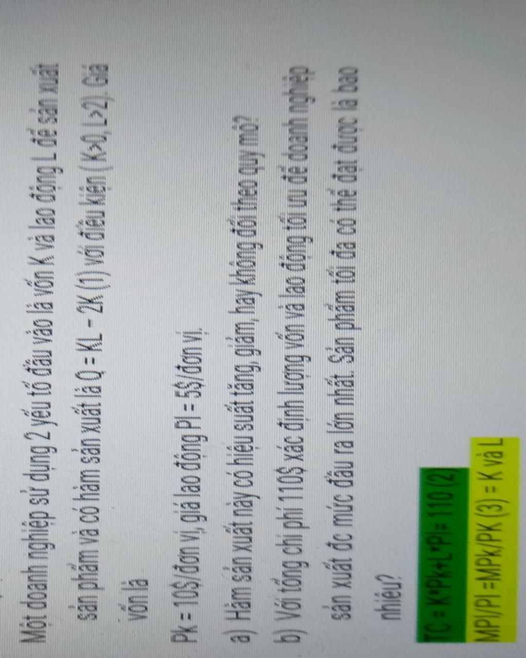 b) Tối đa hóa sản lượng đầu ra $\Leftrightarrow \begin{cases}KP_K + LP_L = TC\\\dfrac{MP_K}{P_K} = \dfrac{MP_L}{P_L}\end{cases}$