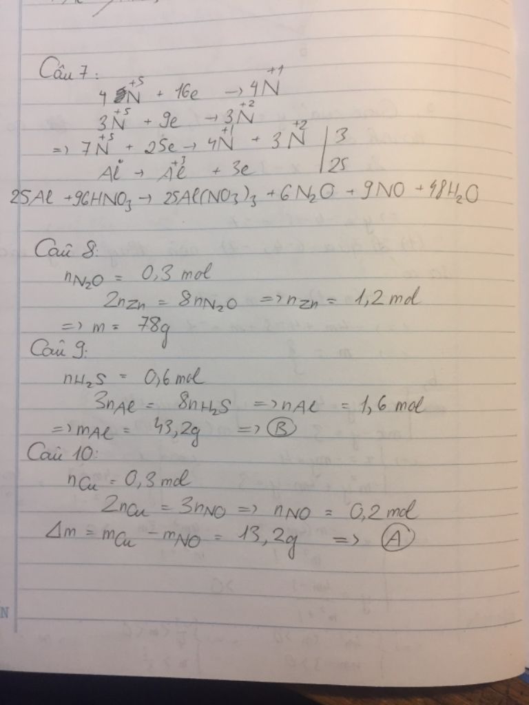 Câu 7. Cho Zn tác dụng với HNO3 thu được hỗn hợp gồm N2O và NO theo tỉ lệ thể tích là 2:3. Tổng hệ số của phản ứng là: