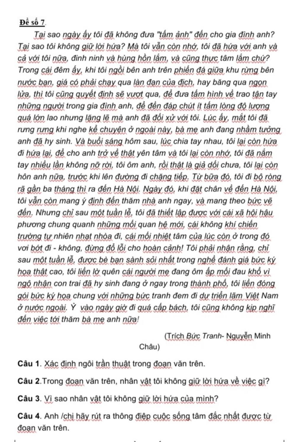 CÂU 2: Trong đoạn văn, Nhân vật tôi không giữ lời hứa về việc sẽ đưa "tấm ảnh" đến cho gia đình anh mà lại đóng gói bức ký họa chung với những bức tranh đem đi dự triển lãm Việt Nam ở nước ngoài.