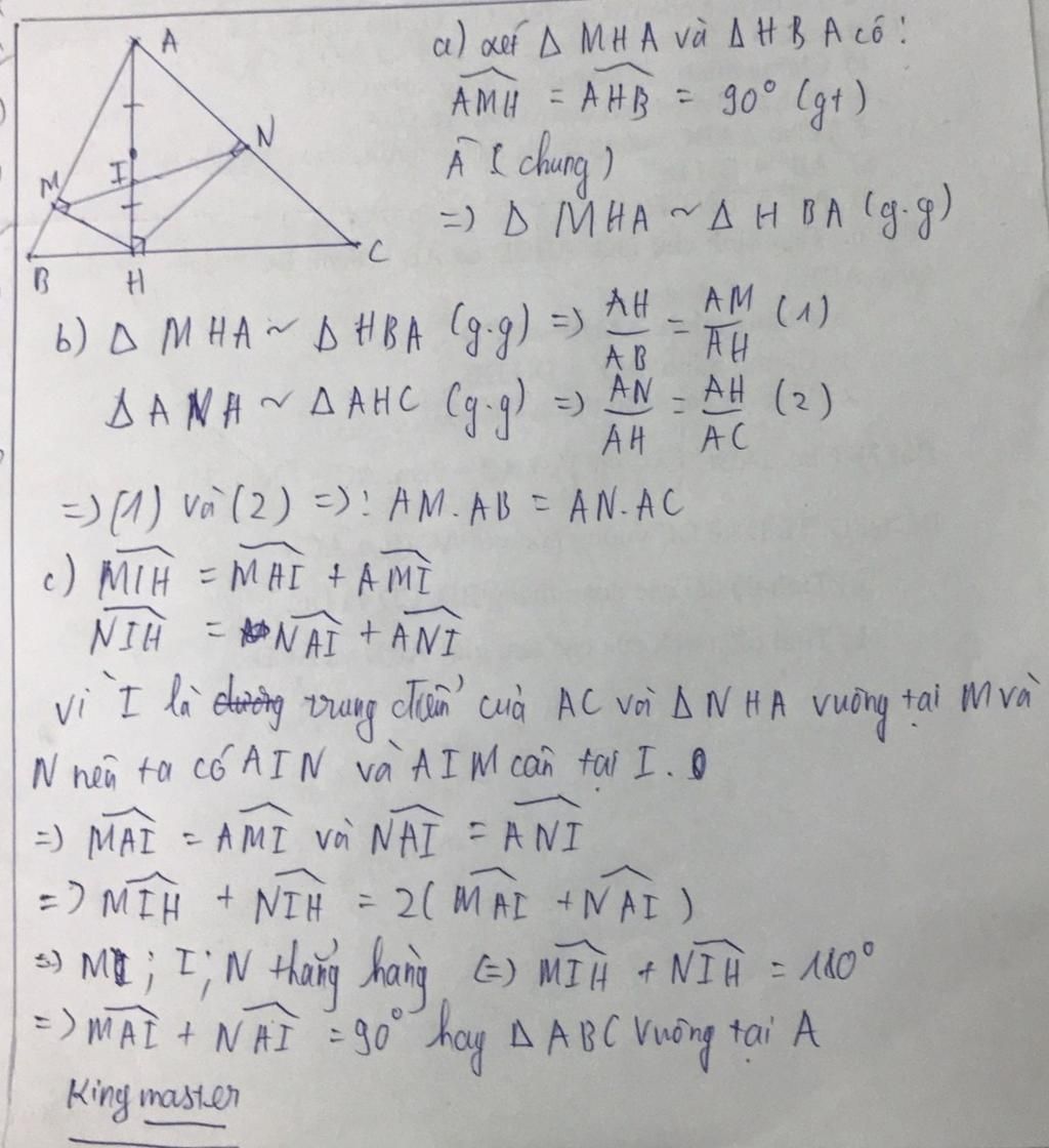 c) Gọi I là trung điểm của AH. Tìm điều kiện của tam giác ABC để M; I; N thẳng hàng.
