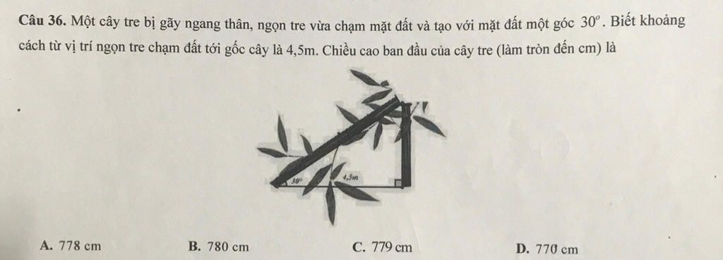 Thân tre gốc $AB$, thân tre gãy $AC$, khoảng cách tử ngọn tre tới gốc $BC=4,5m$, góc tạo bởi thân tre gãy và mặt đất: $\widehat{C}$