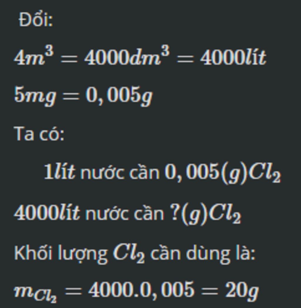 Câu 3: Clo hiện được dùng phổ biến làm chất diệt trùng nước sinh hoạt. Biết để diệt trùng 1 lít nước sinh hoạt cần dùng 5 mg khí Cl2 hòa tan. Cần bao gam Cl2 để diệt trùng 4 m3 nước sinh hoạt?