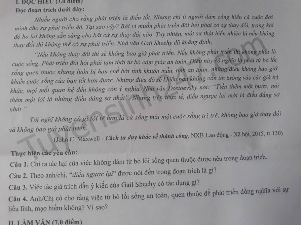 Câu 4. Anh/Chị có cho rằng việc từ bỏ lối sống an toàn, quen thuộc để phát triển đồng nghĩa với sự liều lĩnh, mạo hiểm không? Vì sao?