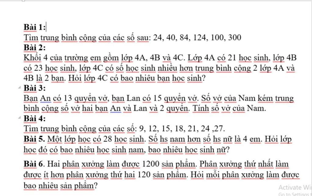 Bài 1: Trung bình cộng của các số sau là: (24+40+84+124+100+300) : 6 = 112