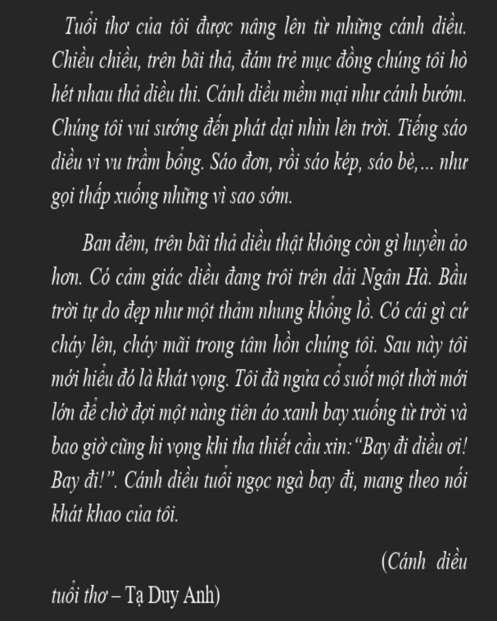 - Cánh diều tuổi thơ hiện lên với biết bao kỉ niệm trong sáng, những hồi ức khó quên của chính tác giả. Hình ảnh cánh diều sẽ sát cánh bên tác giả suốt cả cuộc đời: tiếng sáo diều vi vu như vẫy gọi về quá khứ, bầu trời tự do thắm thiết mãi trong lòng, đôi con diều sáo bay bay tít tắp chân trời, mang theo bao ước mơ và khát vọng… Cũng qua hình ảnh đôi con diều sáo, tác giả muốn nhắn nhủ mỗi chúng ta cần luôn có cho mình những ước mơ và khát vọng, và hãy hành động để thắp sáng những ước mơ và khát vọng ấy, bay cao, bay xa mãi như những cánh diều kia-thỏa sức mình, nỗ lực bay cao giữa chân trời rộng lớn.