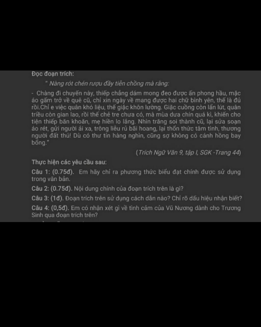 Câu 1: Tự sự kết hợp biểu cảm Câu 2: Nội dung của đoạn trích trên là nói về sự sắp chia ly của chồng và Vũ Nương. Khi biết chồng đi lính, thì không mong công danh mà chỉ hy vọng chồng trở về bình an, hết lòng chung thủy chờ đợi chồng. Qua đó cũng thấy được sự đau xót và tiếc thương của tác giả cho số phận người con gái trong xã hội phong kiến xưa. Câu 3: Dùng phép thế để dẫn trong đoạn trích. Phép thế: từ "nàng", "vợ" thế cho từ "Vũ Nương" Câu 4: Trong hoàn cảnh chia li, khi tiễn chồng ra chiến trận, Vũ Nương đã bày tỏ tình cảm thắm thiết với chồng bằng những lời tình nghĩa: “Chàng đi chuyến này, thiếp chẳng dám … thế là đủ rồi”. Nàng không ham vinh hoa phú quý, chỉ mong muốn có một gia đình hạnh phúc, ấm êm. Nàng cảm thông trước những nỗi vất vả gian lao mà chồng sẽ phải chịu đựng nơi chiến trận: “Chỉ e việc quân khó liệu, thế giặc … lo lắng.” Những lời ấy của Vũ Nương thể hiện nàng là một người vợ hết mực thùy mị, dịu dàng, yêu chồng và coi trọng hạnh phúc gia đình.