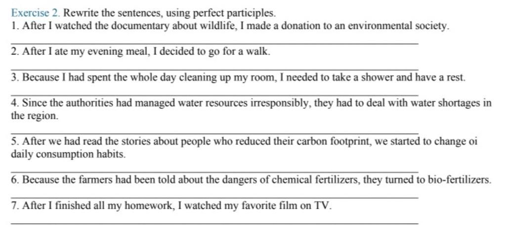 ` 1. ` Having watched the documentary about wildlife, I made a donation to an environmental society.