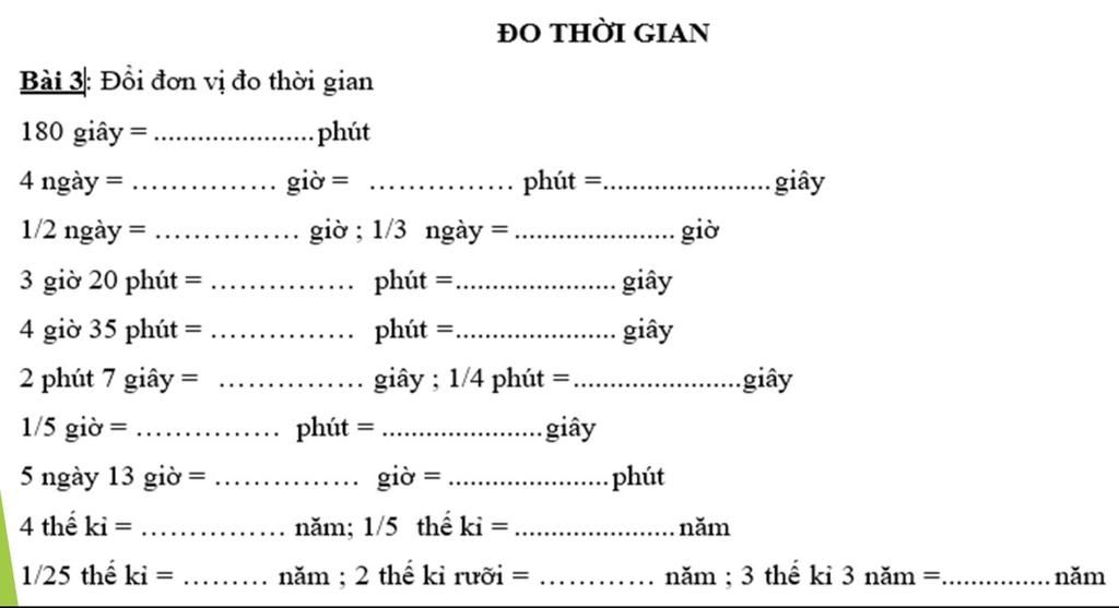 180 giây = 3 phút 4 ngày = 96 giờ = 5760 phút = 354600 giây 1/2 ngày = 12 giờ ; 1/3 ngày = 8 giờ 3 giờ 20 phút = 200 phút = 12000 giây 4 giờ 35 phút = 275 phút = 16500 giây 1/5 giờ = 12 phút = 720 giây 5 ngày 13 giờ = 133 giờ = 7980 giây 4 thế kỉ = 400 năm ; 1/5 thế kỉ = 20 năm 1/25 thế kỷ = 4 năm ; 2 thế kỉ rưỡi = 250 năm ; 3 thế kỉ 3 năm = 303 năm Rút gọn180 giây = 3 phút 4 ngày = 96 giờ = 5760 phút = 354600 giây 1/2 ngày = 12 giờ ; 1/3 ngày = 8 giờ 3 giờ 20 phút = 200 phút = 12000 giây 4 giờ 35 phút = 275 phút = 16500 giây 1/5 giờ = 12 phút = 720 giây 5 ngày 13 giờ = 133 giờ = 7980 giây 4 thế ... xem thêm