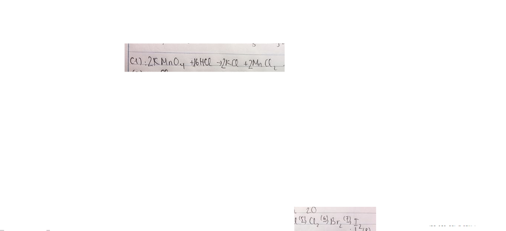 2KMnO4+ 16HCl -> 2KCl+ 2MnCl2+ 5Cl2+ 8H2O