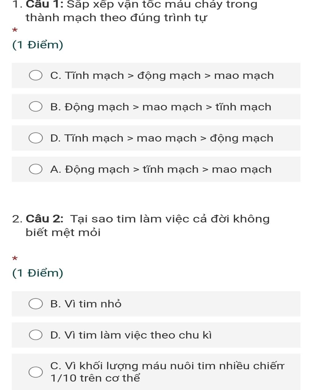 Câu 2:D Vì tim làm việc theo chu kì