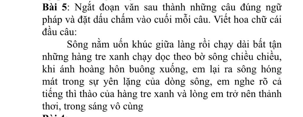 Sông nằm uốn khúc giữa làng rồi chảy dài bất tận. Những hàng tre xanh chạy dọc theo bờ sông. Chiều chiều, khi ánh hoàng hôn buông xuống, em lại ra sông hóng mát. Trong sự yên lặng của dòng sông, em nghe rõ cả tiếng thì thaofcuar hàng tre xanh. Và lòng em trở nên thảnh thơi, trong sáng vô cùng