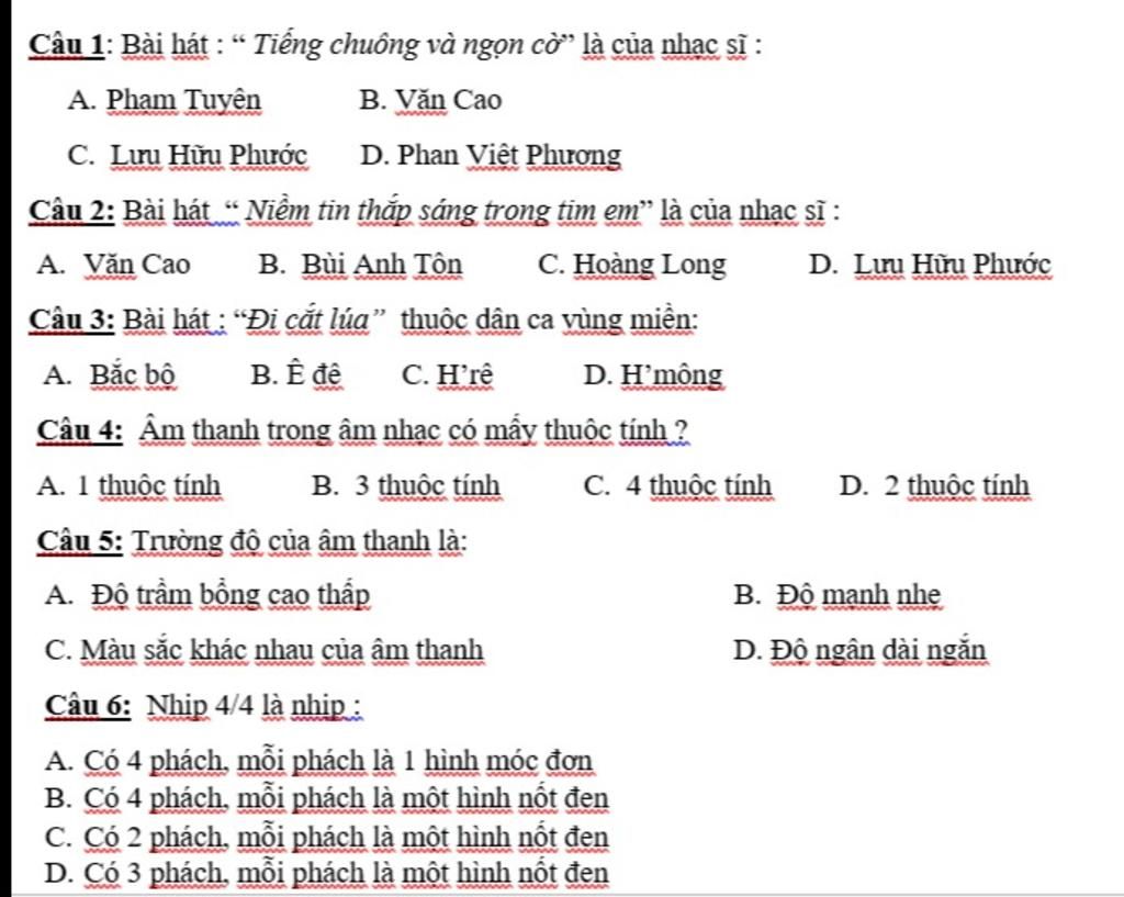 Câu 6 : B . Có 4 phách , mỗi phách là một hình nốt đen