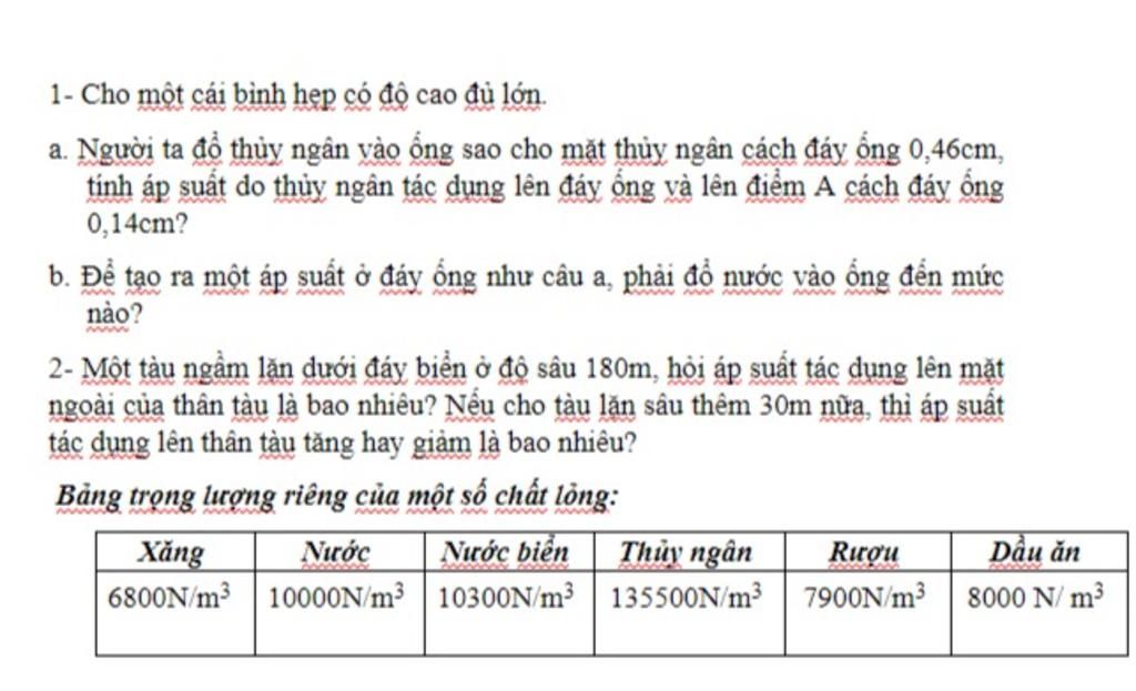 a. Người ta đổ thủy ngân vào ống sao cho mặt thủy ngân cách đáy ổng 0,46cm,