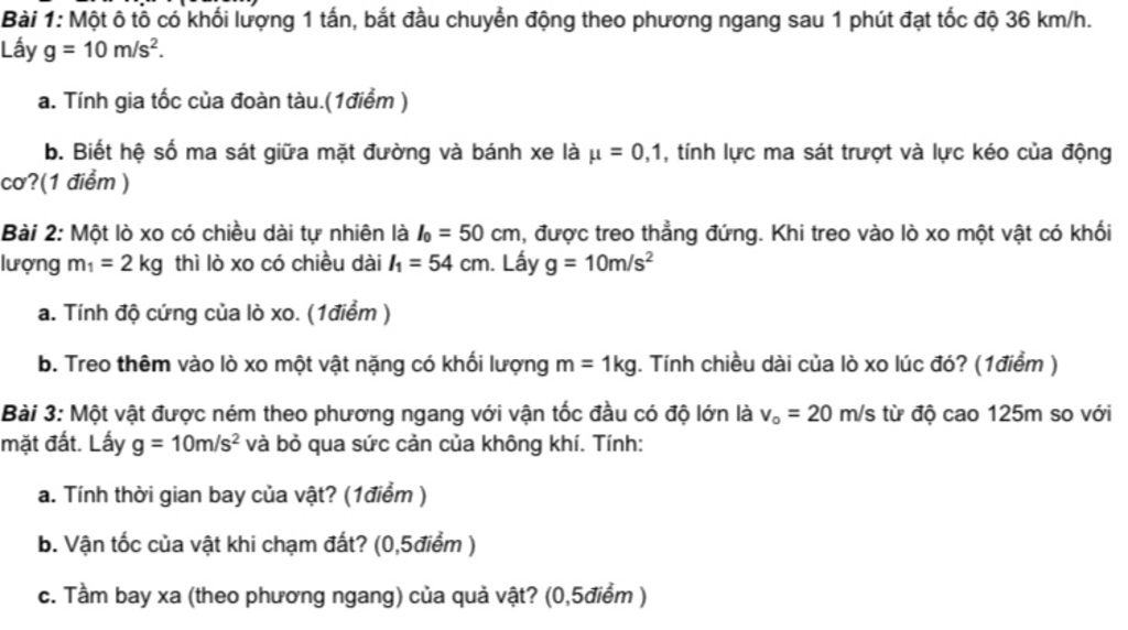 Bài 1: Một ô tô có khối lượng 1 tấn, bắt đầu chuyển động theo phương ngang sau 1 phút đạt tốc độ 36 km/h.