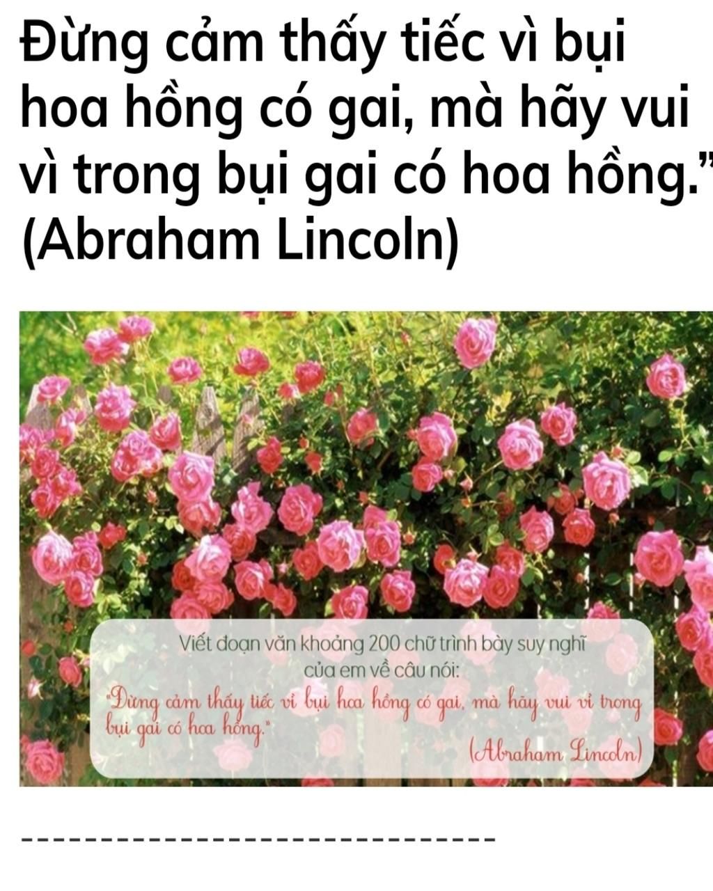 "Đừng cảm thấy tiếc vì bụi hoa hồng có gai, mà hãy vui vì trong bụi gai có hoa hồng" - Abraham Lincoln. Câu nói trên muốn nhấn mạnh đến việc chúng ta nên nhìn nhận cuộc sống theo chiều hướng tích cực hơn. Góc nhìn trong tâm thế tích cực sẽ cho ta thấy cuộc sống tràn đầy những mảng màu đa sắc, rực rỡ thay vì đơn sắc, nhạt nhẽo. Bụi hoa hồng là hoa hồng khi nó có gai, nếu nó không có gai thì đâu còn là hoa hồng. Để được là hoa hồng, thân nó mang những cái gai sắc bén. Điều đó cũng tạo cho nó vẻ đẹp quyến rũ nhưng cũng không kém phần sắc lạnh. Nhìn nhận cuộc sống ở hướng tích cực, ta sẽ thấy mọi vấn đề đều có con đường để giải quyết, chỉ cần ngồi lại bình tĩnh suy xét, thay vì cho tất cả đi vào ngõ cụt để rồi tràn ngập tuyệt vọng và bế tắc. Việc tìm ra, công nhận những điểm tốt, những vẻ đẹp sẽ giúp chúng ta biết yêu thương nhiều hơn, đồng cảm, bao dung và sẻ chia nhiều hơn. Hy vọng sẽ được thắp lên khi ta nhìn thấy “trong bụi gai có hoa hồng” bởi giữa mọi thứ đem lại buồn đau hay xấu xí vẫn xen lẫn những vẻ đẹp luôn ẩn khuất, không quá khó để kiếm tìm. Người biết đủ mới là người hạnh phúc. Hãy chấp nhận những sự không hoàn hảo, vì đôi khi chính những điều không hoàn hảo ấy mới là yếu tố tạo nên sự khác biệt.