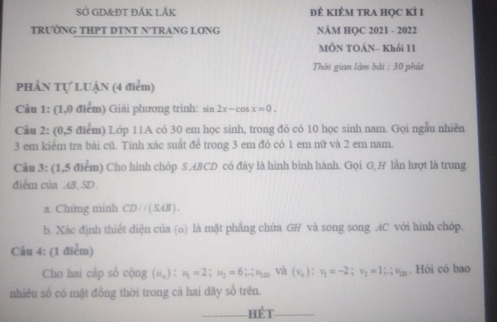 Câu 2: (0,5 điểm) Lớp 11A có 30 em học sinh, trong đó có 10 học sinh nam. Gọi ...
