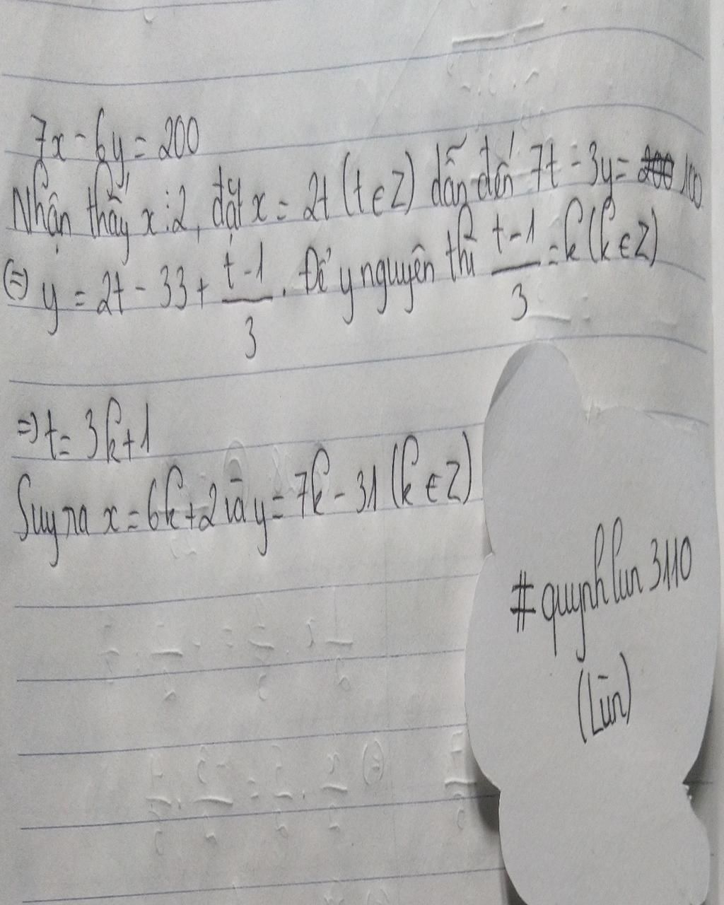 Vậy phương trình có nghiệm nguyên là : `x = (2k)/7` và `y = (k-100)/3`
