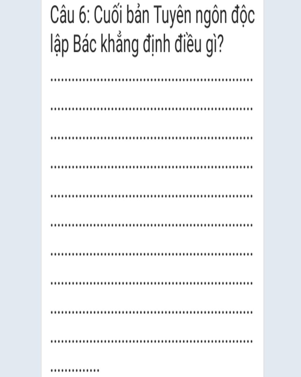 `=>` “Nước Việt Nam có quyền hưởng sự tự do và độc lập, và sự thật đã thành một nước tự do độc lập. Toàn thể dân tộc Việt Nam quyết đem tất cả tinh thần và lực lượng, tính mạng và của cải để giữ vững quyền tự do, độc lập ấy”.