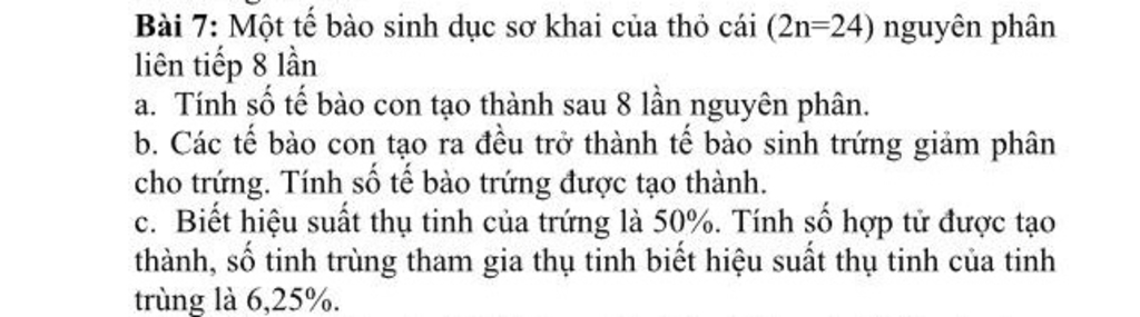 -Các tế bào con tạo ra đều trở thành tế bài sinh trứng giảm phân cho trứng ,tính số tế bào trứng được tạo thành:256