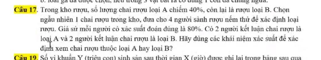 Câu 17. Trong kho rượu, số lượng chai rưou loại A chiếm 40%, còn lại là rượu loại B. Chọn