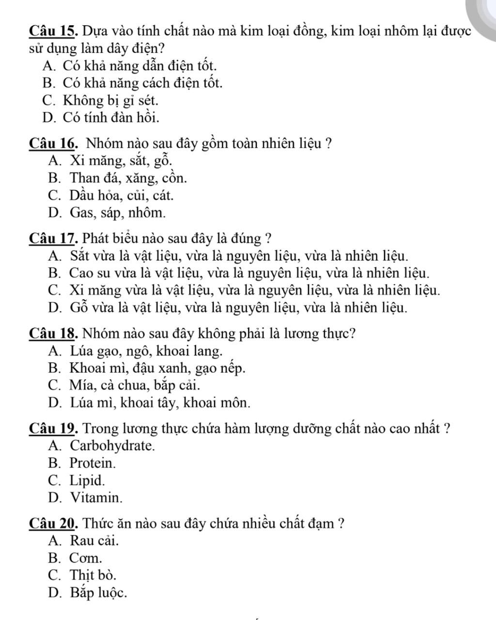 Câu 18. Nhóm nào sau đây không phải là lương thực?