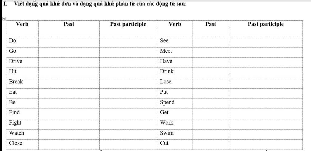 I. Viết dạng quá khứ đơn và dạng quá khứ phân từ của các động từ sau:
