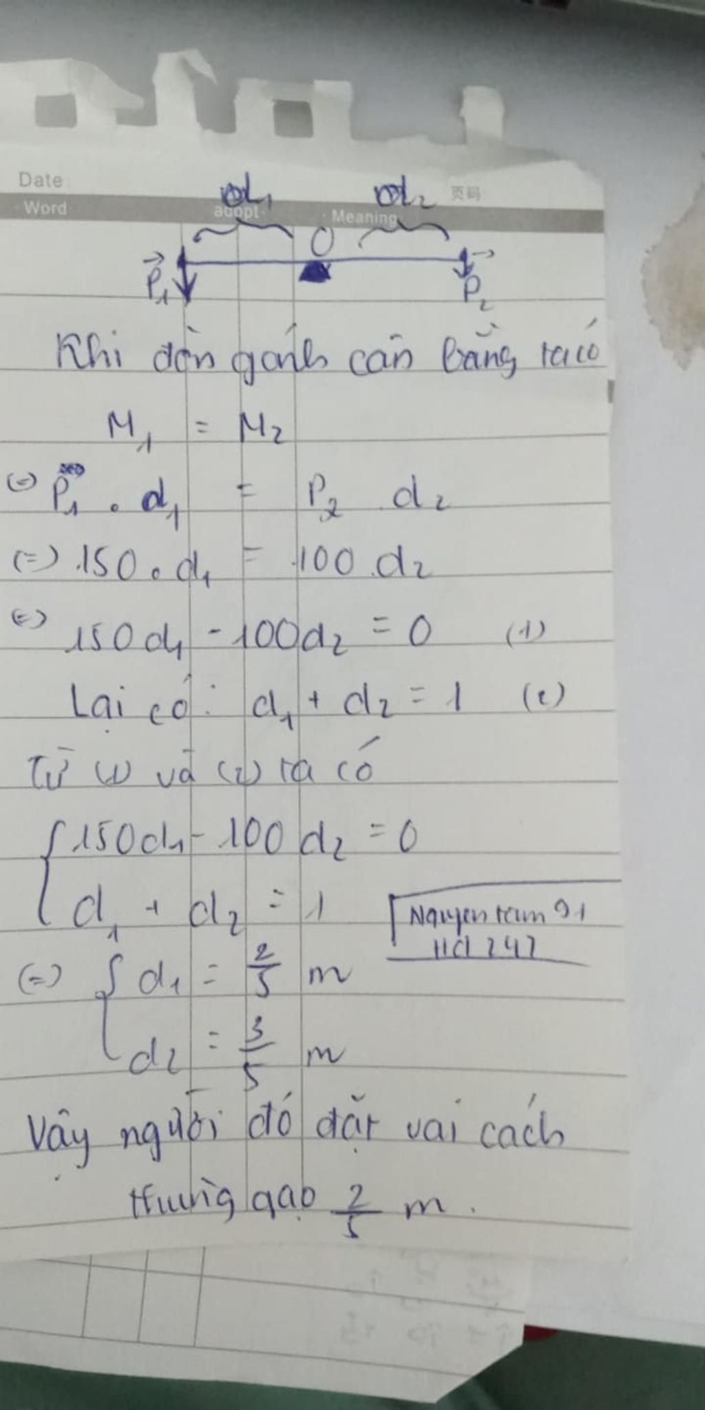 Áp dụng quy tắc momen lực, để hai vật cân bằng thì :