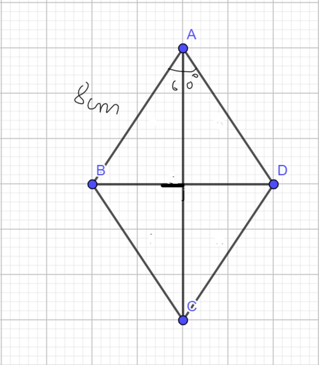 `\text{ Theo đề bài ta có được hình thoi }` ` ABCD, \hat{A} = 60^o , AB = 8cm `
