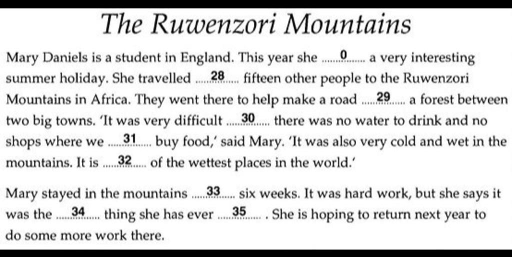 She travelled (28)........... fifteen other people to the Ruwenzori Mountains in Africa.