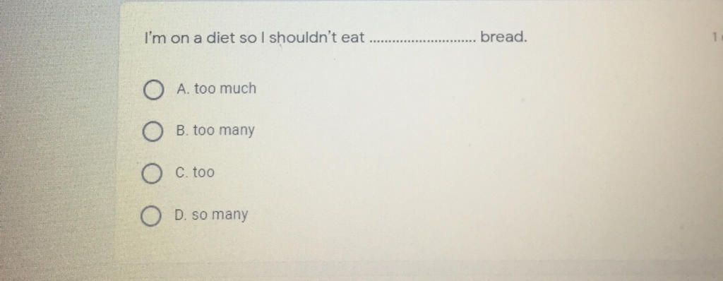 `-` Too much được dùng với danh từ không đếm được (do bread là N không đếm được)