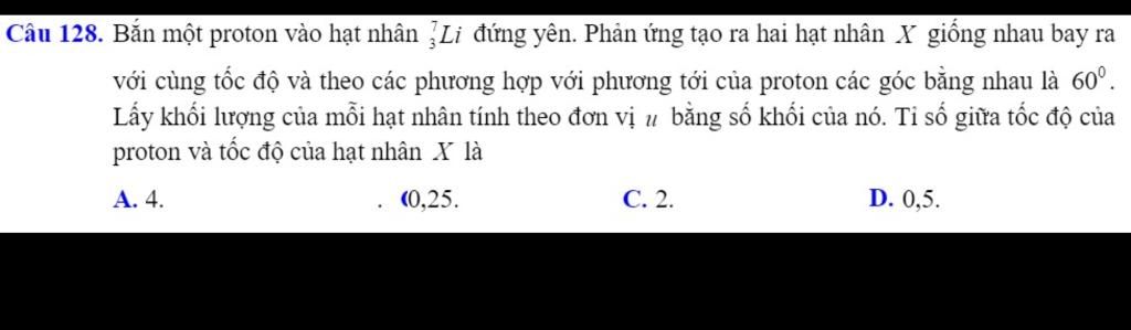 Câu 128. Bắn một proton vào hạt nhân Li đứng yên. Phản ứng tạo ra hai hạt nhân X giống nhau bay ra