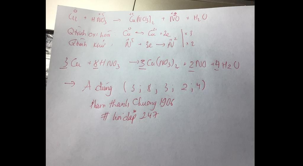 Giải thích các bước giải: 3Cu + 8HNO3 -> 3Cu(NO3)2 +2NO + 4H2O