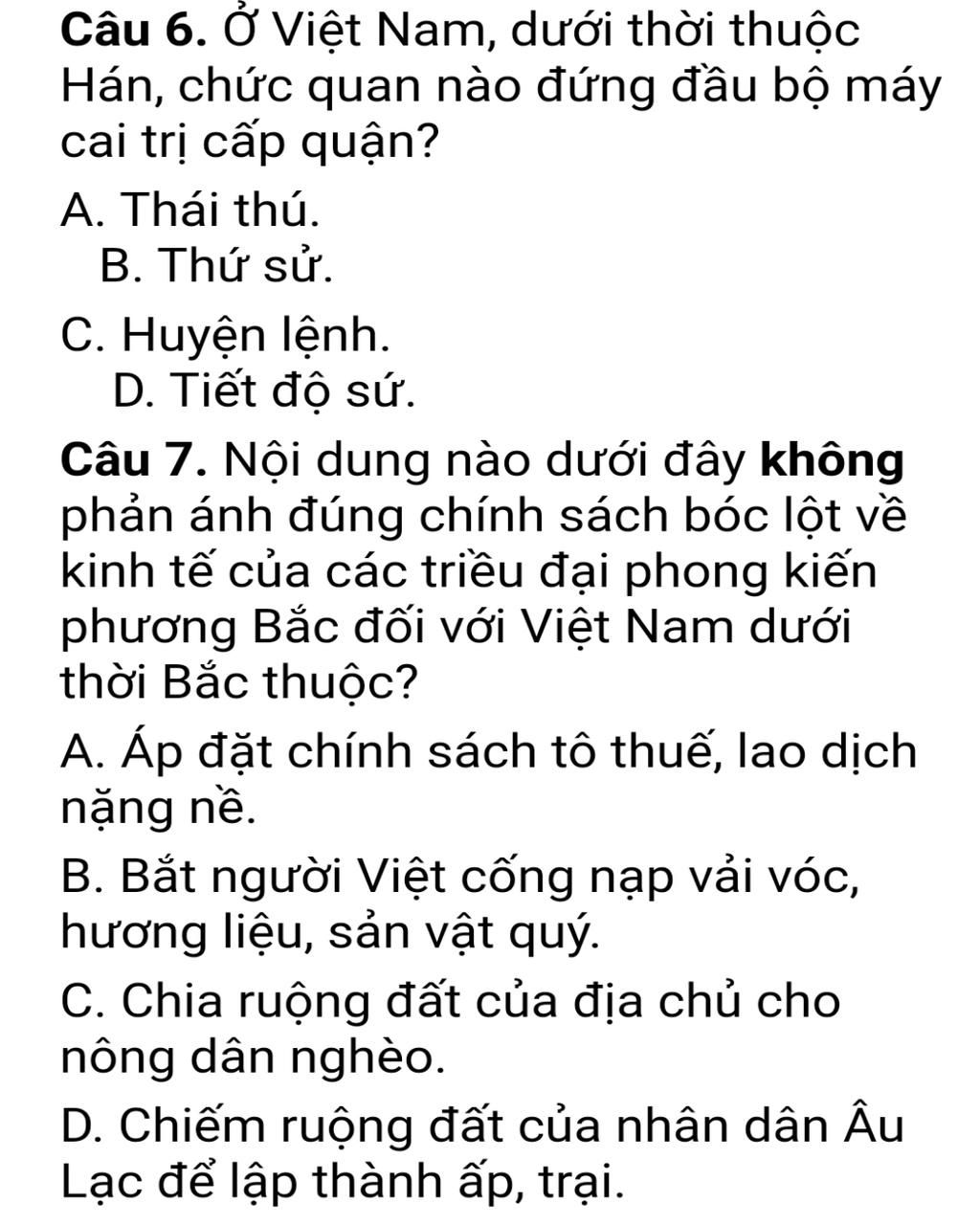 Câu 7. Nội dung nào dưới đây không phản ánh đúng chính sách bóc lột về kinh tế của các triều đại phong kiến phương Bắc đối với Việt Nam dưới thời Bắc thuộc?