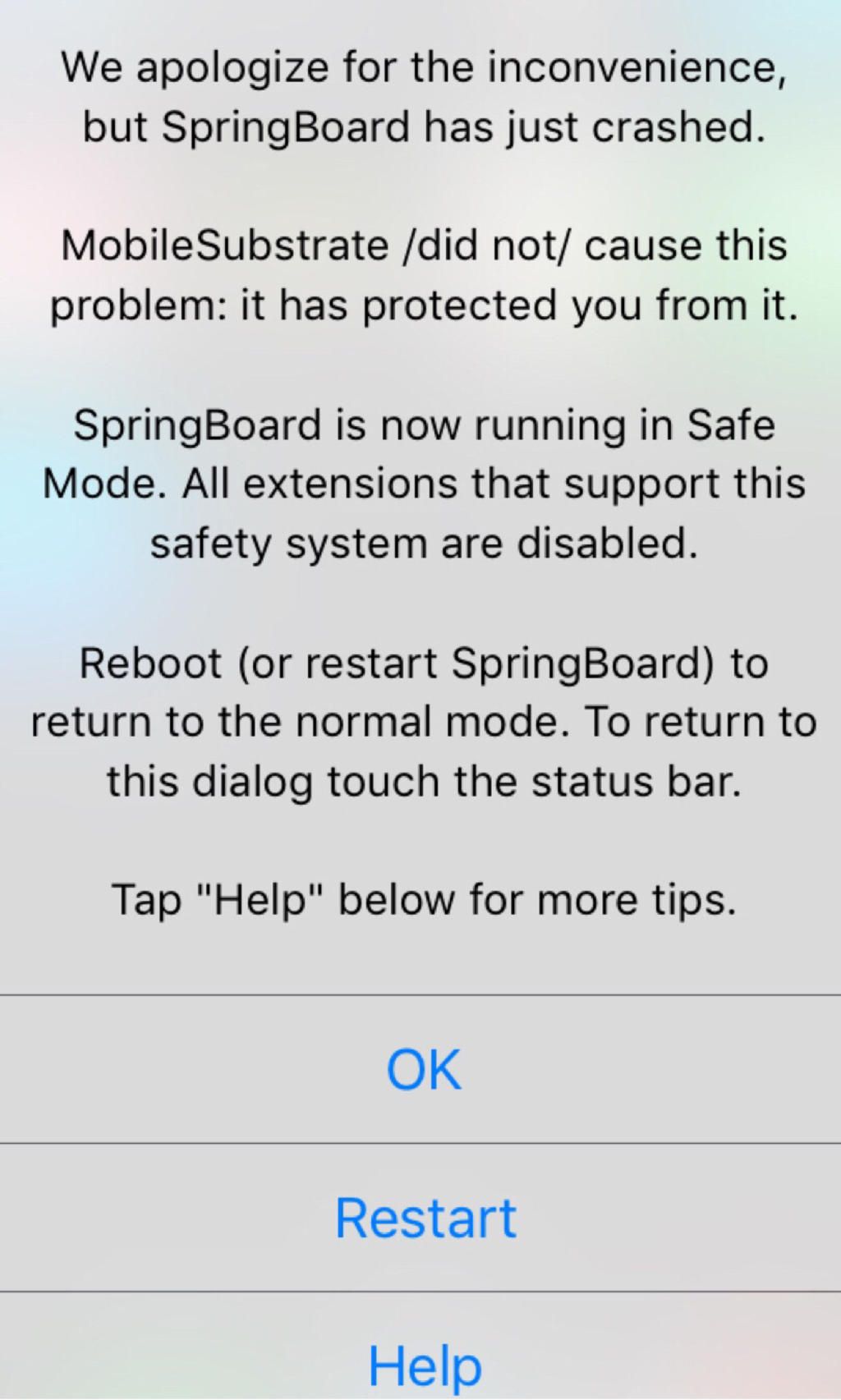 SpringBoard is now running in Safe Mode. All extensions that support this