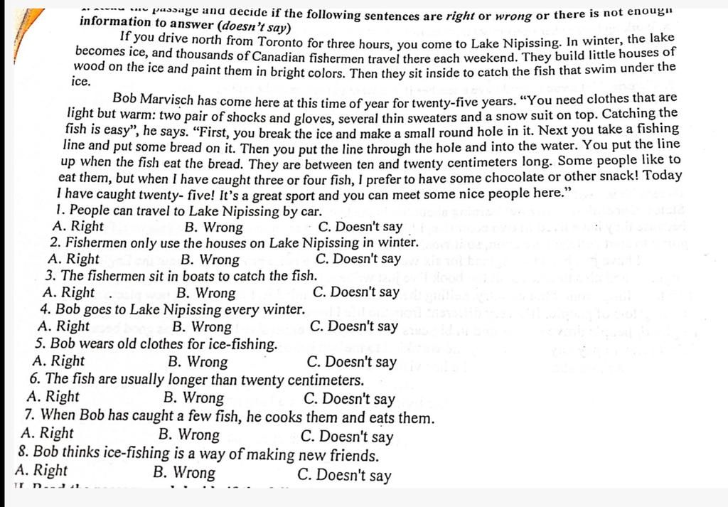 1. A (If you drive north from Toronto for three hours, you come to Lake Nipissing)