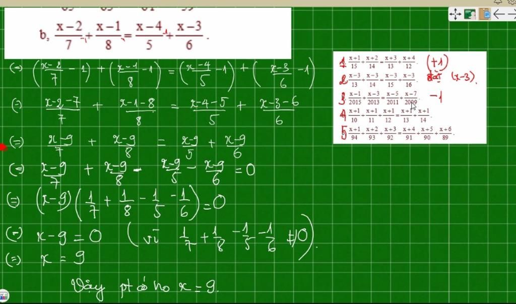 `<=> ((x-1)/2015-1)+((x-3)/2013-1)=((x-5)/2011-1)+((x-7)/2009-1)`