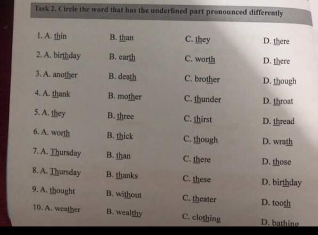 2-D (câu d phát âm là d còn lại phát âm là th)