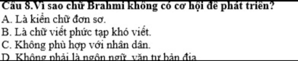 Câu 8.Vì sao chữ Brahmi không có cơ hội đề phát triển?