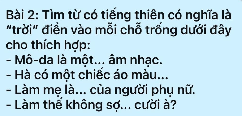 Bài 2: Tìm từ có tiếng thiên có nghĩa là “trời” điền vào mỗi chỗ trống dưới đây cho thích hợp: