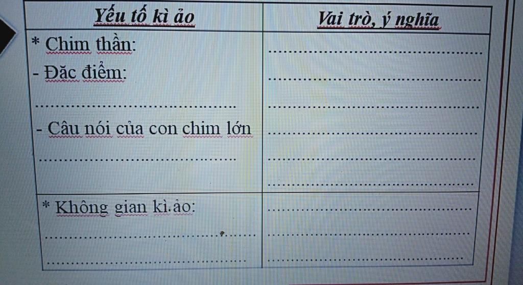 → Con vật kì ảo nằm trong danh sách lực lượng thần kì của thế giới cổ tích; xuất hiện nhằm tạo ra những điều kì diệu; thực hiện chức năng ban thưởng cho nhân vật tốt hoặc trừng phạt nhân vật xấu.