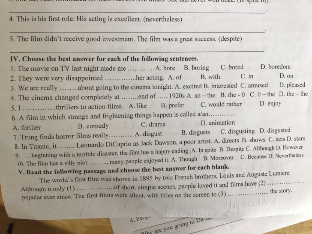 IV. Choose the best answer for each of the following sentences.
