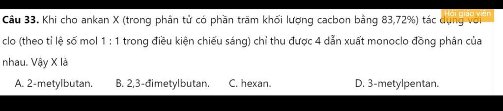 Vì `X(C_6H_{14})` tác dụng với `Clo` tạo `4` dẫn xuất monnoclo