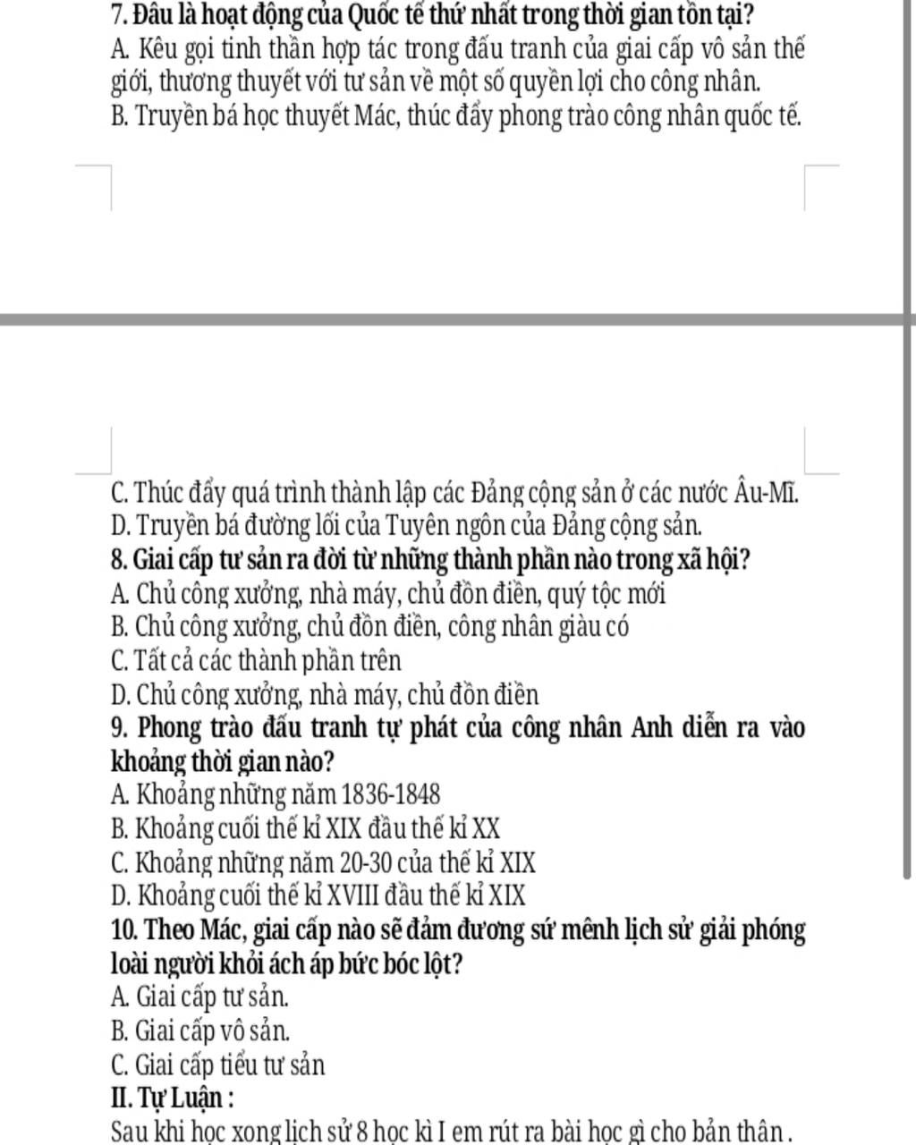 7. Hoạt động của quốc tế thứ nhất trong TG tồn tại :