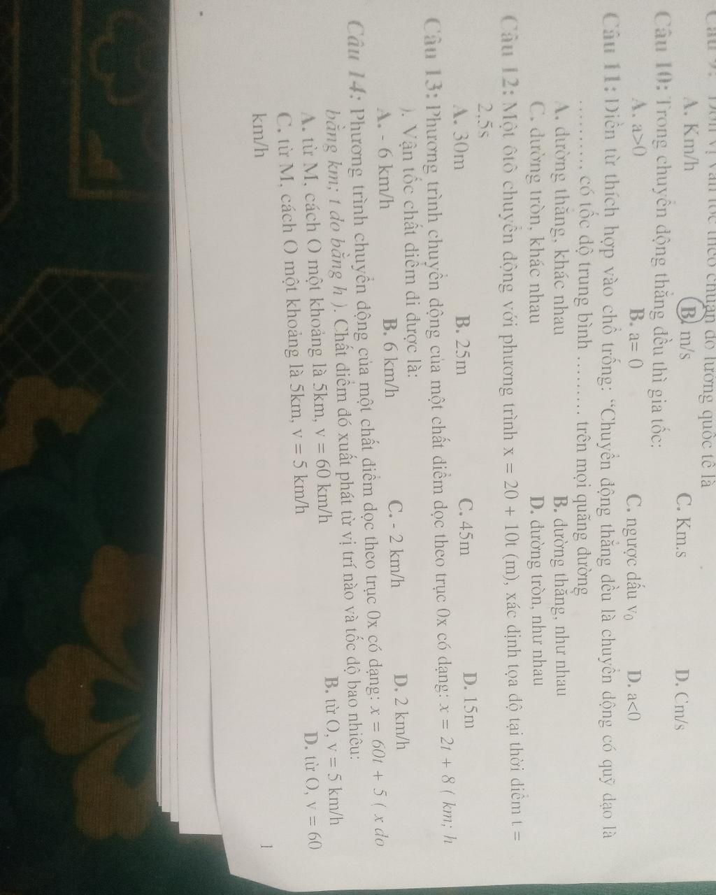 Câu 3: một ôtô chuyển động với phương trình x=20+10t (m), xác định tọa độ tại thời điểm t= 2,5s A.30m