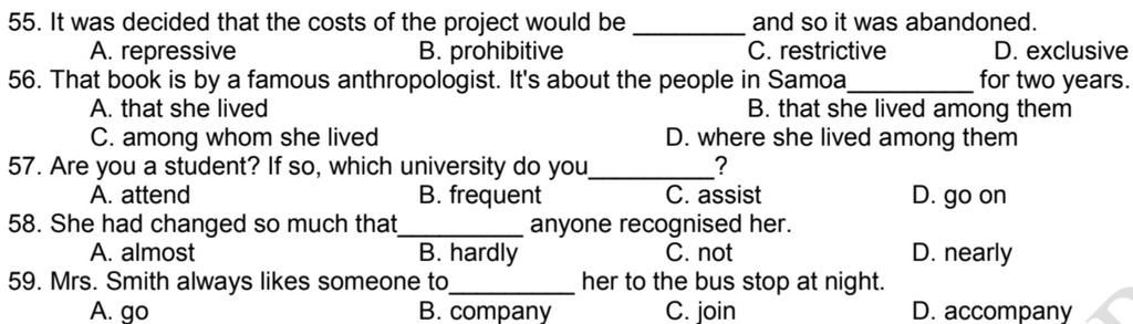 55. B prohibitive ~ giá cao đến mức không thể mua được/ngăn cấm
