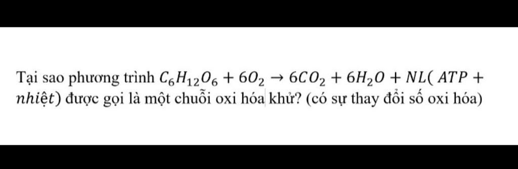 $\mathop{C_{6}}\limits^{0}$$\mathop{H_{12}}\limits^{+1}$$\mathop{O_{6}}\limits^{-2}$ + $6$$\mathop{O_{2}}\limits^{0}$ → $6$$\mathop{C_{}}\limits^{+4}$$\mathop{O_{2}}\limits^{-2}$ + $6$$\mathop{H_{2}}\limits^{+1}$$\mathop{O_{}}\limits^{-2}$ + $NL$ $(ATP + nhiệt)$