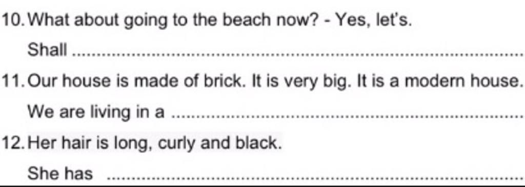 11. Our house is made of brick . It is very big . It is a morden house . ( dịch : Ngôi nhà của chúng tôi được làm bằng gạch. Nó rất lớn . Nó là một ngôi nhà hiện đại . )