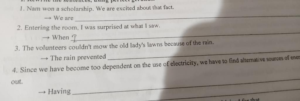 1. We’re excited about Nam’s having won a scholarship. 2. When I entered the room, I was surprised at what I saw.