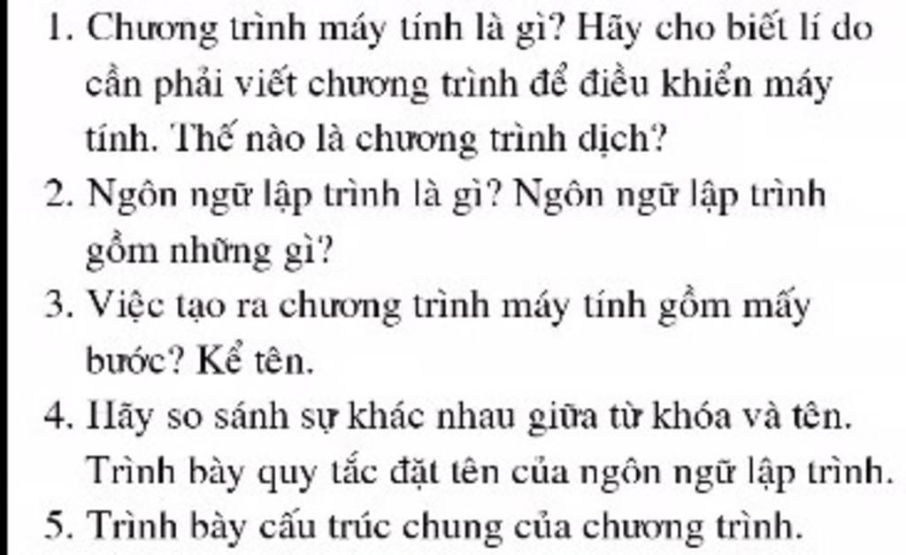 Đáp án ; Câu 1 :- Chương trình máy tính là tập hợp các câu lệnh thực hiện một tác vụ cụ thể khi được máy tính thực thi. Hầu hết các thiết bị máy tính yêu cầu các chương trình để hoạt động đúng. Một chương trình máy tính thường được viết bởi một lập trình viên máy tính bằng ngôn ngữ lập trình.