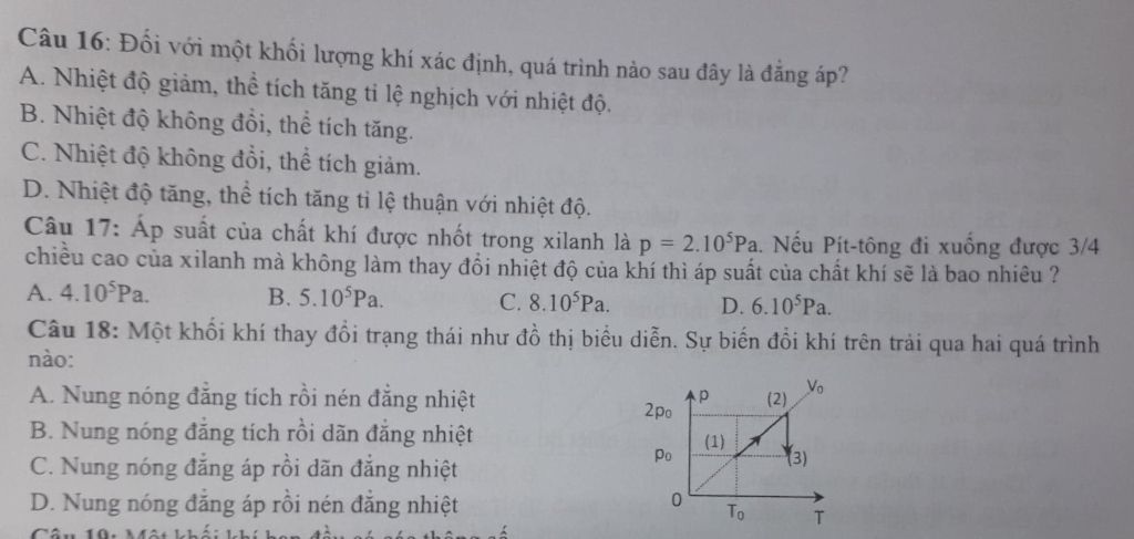 Câu 16:Trong quá trình đẳng áp thì: V/T=Const